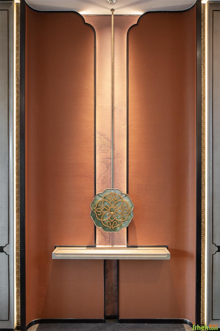 餐廳吊頂提取梅花元素,與墻頂連通形成整體,窗邊背景植入水墨畫(huà),古意雅致與中式朦朧感渾然而成。