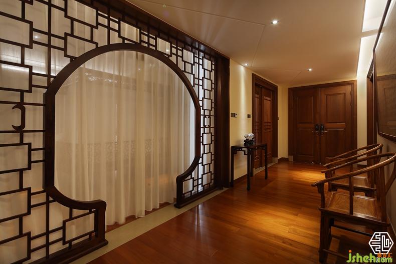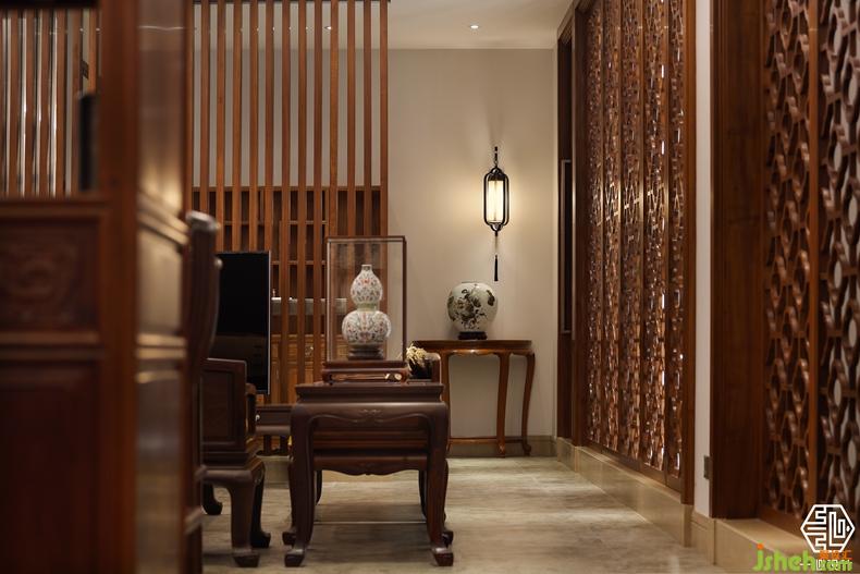 該案由兩個別墅圍合成一個院落形式,故稱合院別墅。設(shè)計師根據(jù)兩位業(yè)主不同愛好,用中式的手法演繹兩種不同風格的中式設(shè)計。其中嶺南人家酷愛柚木,酷愛紅木家私,別墅裝飾設(shè)計師巧妙的合其所好,熾烈的嶺南文化與奔騰的紅木藝術(shù)風格相互融合,形成了具有南方特色的中式別墅風格。