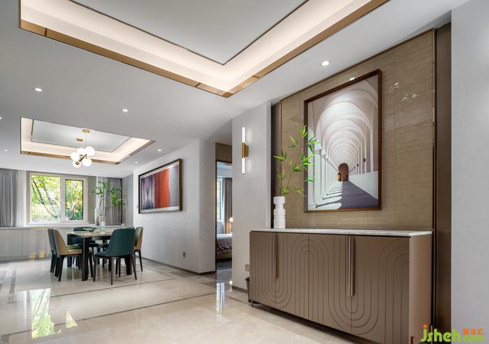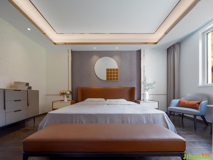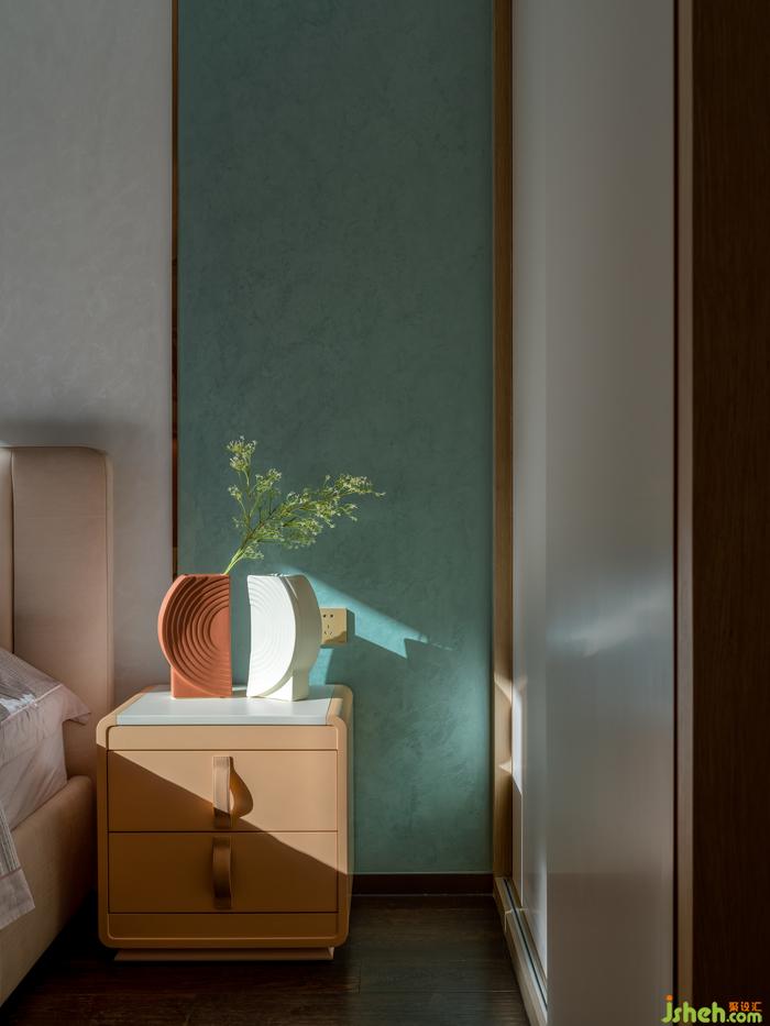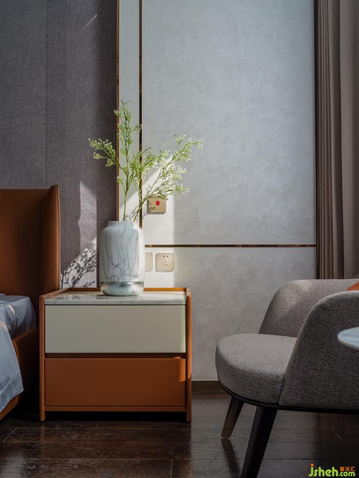 背景墻的灰色皮革,搭配一圓一方幾何圖形的裝飾畫(huà),簡(jiǎn)潔中透露著精致的細(xì)節(jié)。