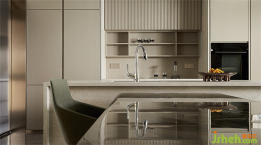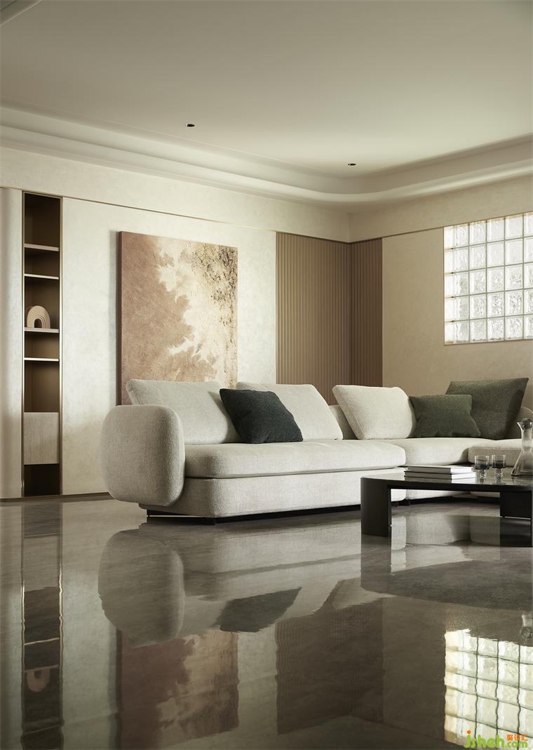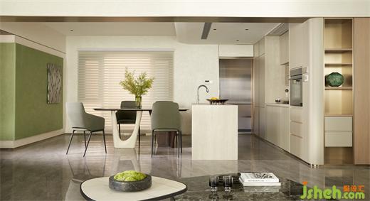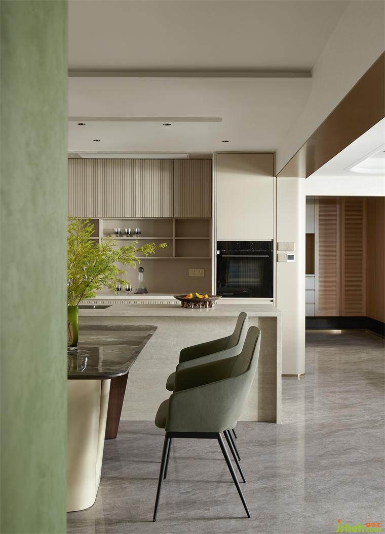 客廳沉穩(wěn)柔和的大地色系,包容著質(zhì)感、材料、光線的互動與變化,住宅設(shè)計營造素雅和簡練的空間氣質(zhì)?;【€感的家具與建筑外窗呼應(yīng)成一體,跳躍的綠色藝術(shù)掛畫與橙色抱枕巧妙地打破了空間的沉悶感。在這個現(xiàn)代主義的時尚空間里,勾勒出溫婉親密的格調(diào)。