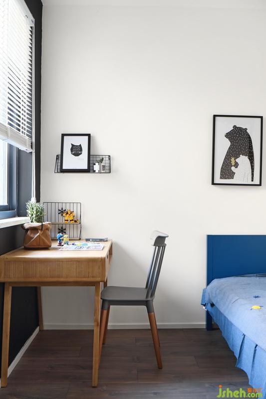推開門就知道這是個(gè)男孩子的房間,簡約藍(lán)色的小床足夠睡到十多歲,墻面的裝飾畫可以更具年齡隨時(shí)更換;靠窗學(xué)習(xí)的小桌子光線充足,白色的百葉窗既可以裝飾又可以很好的遮擋光線,對了進(jìn)門的左手邊有一整面黑板墻可以讓寶貝在這個(gè)活潑的年齡跟著自己的小伙伴在自己的小天地隨手涂鴉,關(guān)門一個(gè)世界開門一個(gè)世界。