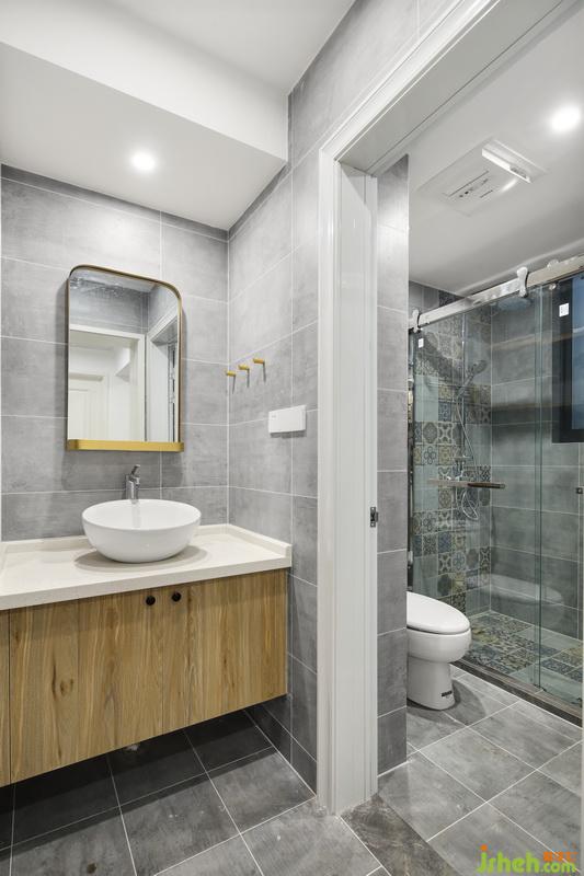 設(shè)計(jì)公司將原來一整個(gè)衛(wèi)生間干濕分離,在衛(wèi)生間里面隔出一個(gè)小的收納空間,解決了換洗衣物的收納,同時(shí)可以放浴巾等洗護(hù)用品;淋浴間的花磚打破水泥磚墻的單調(diào)乏味。
