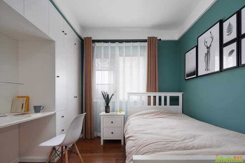 兒童房衣柜結(jié)合書桌,即滿足了儲(chǔ)物的實(shí)用性,又節(jié)省了臥室的空間,灰度藍(lán)墻面、大地色窗簾、動(dòng)物森系風(fēng)裝飾畫,使空間增加了小孩特有的純真。 室內(nèi)設(shè)計(jì)師