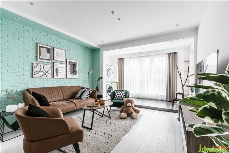 客廳沙發(fā)背景墻使用了文化磚,配上清新的薄荷綠,舒適而具有強(qiáng)調(diào)感的家具,在多元素的裝點(diǎn)下,達(dá)到一種平衡狀態(tài),和諧且有趣。