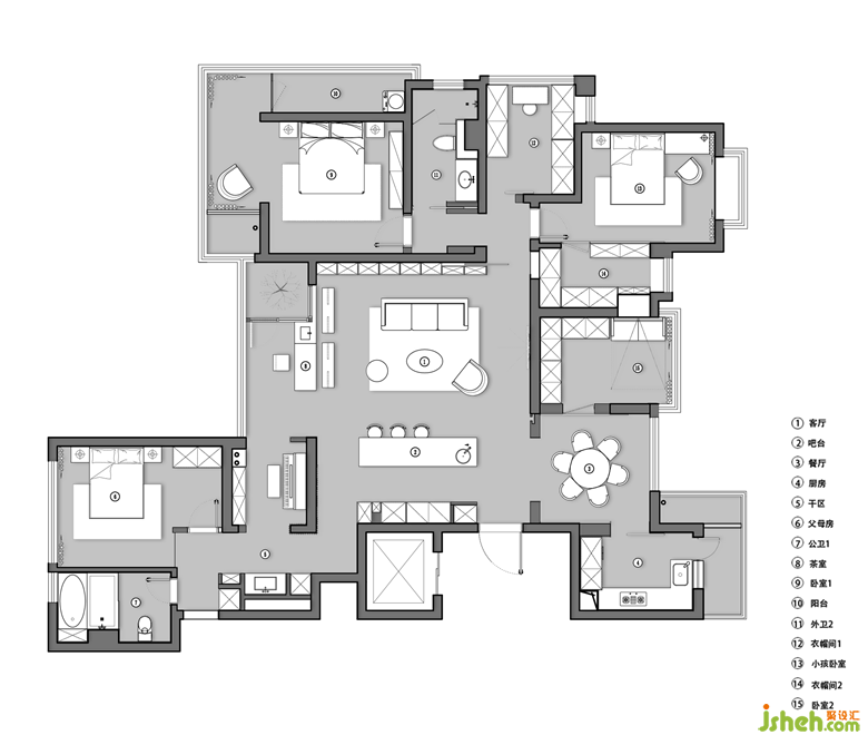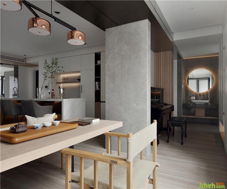 在空間布局上,我們規(guī)劃了一個開放空間,放置西廚、客廳、茶桌、鋼琴等功能區(qū),這個空間承載了男女主人和女兒各自的愛好,循序展開,又互相聯(lián)系,我們定義這個空間為精神空間。以精神空間為中島,依次展開臥室、餐廚和衛(wèi)生間等空間。室內(nèi)設計師