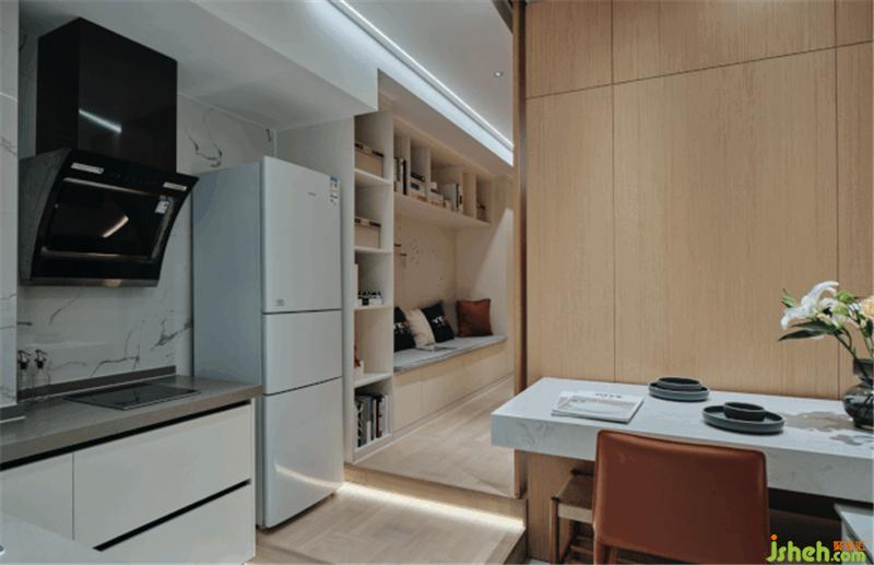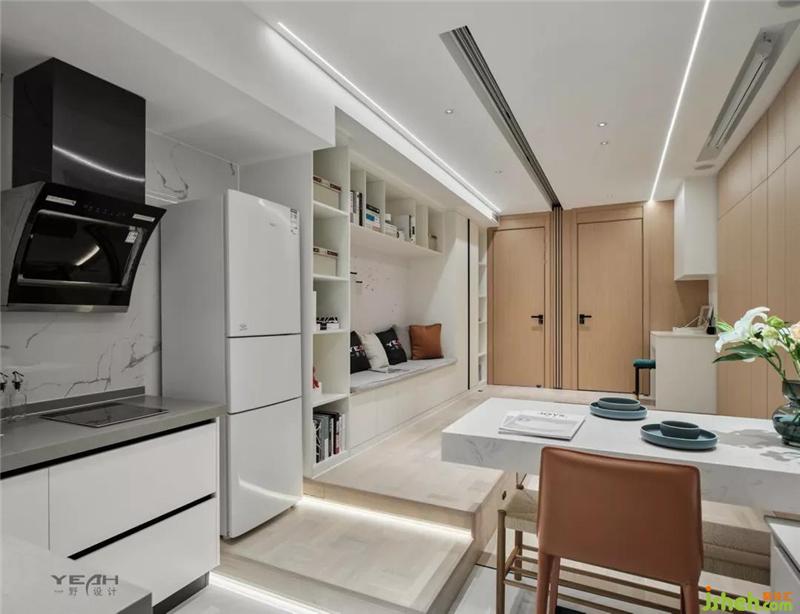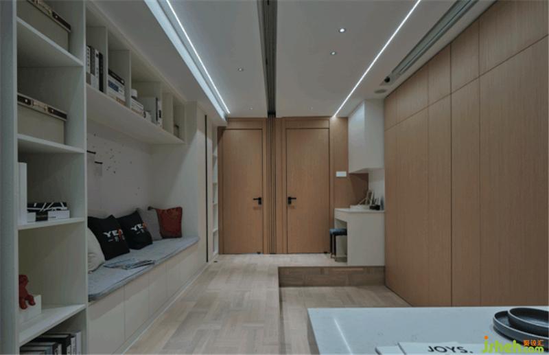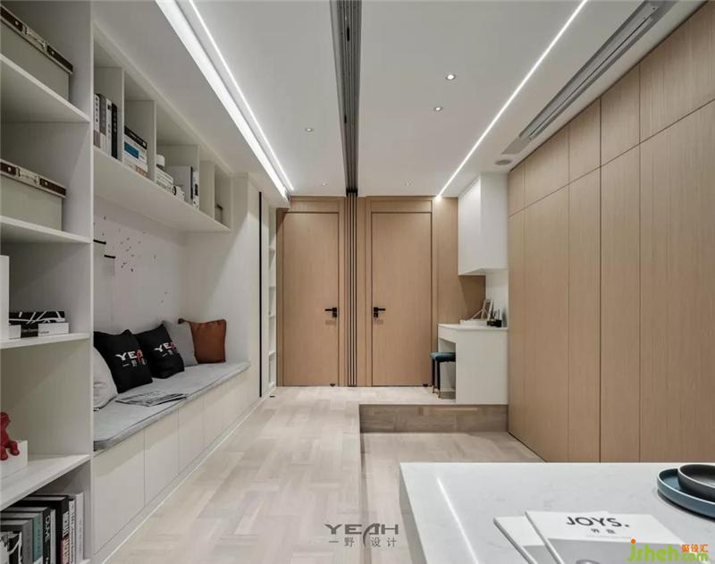 地面的抬高,移動的門板,整塊的護墻的移動數(shù)十秒就可以把客廳變?yōu)榕P室,簡單、便捷,室內(nèi)設(shè)計師真正實現(xiàn)了空間的轉(zhuǎn)換。