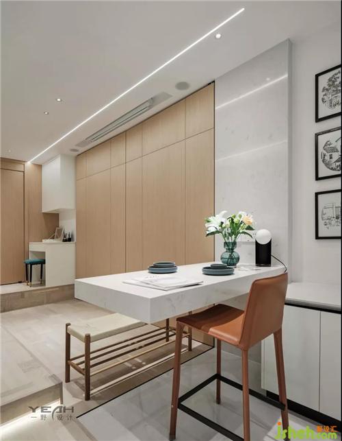 餐廳的設(shè)計上我們采用的是石材,從餐桌一直延伸到臺面高低錯落滿足大人和小朋友同時就餐。同時地面,墻面,頂面 我們?nèi)坎捎冒咨浜蠠艄庠O(shè)計提亮整個室內(nèi)設(shè)計師空間。