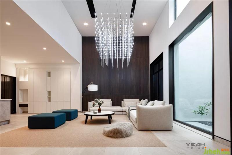 The interior uses dark gray and cream sofas, geometric coffee tables, and other simple furnishings to decorate the house, such as cotton and linen fabrics are widely used.