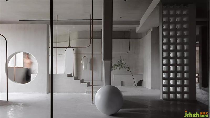 An empty shell creates countless partitions for it as a clothing display. This is too rigid. Break them with straight lines or arcs, and then regroup. No matter where you stand, you can look at it with a different sense of space. , And the shape of these lines cut the light into different shapes.