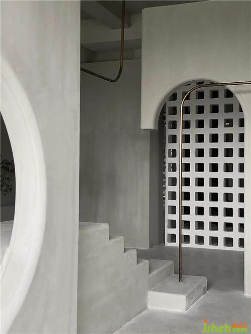 The two exhibition spaces use arrayed space bricks as semi-partitions to successfully introduce the north and south light sources into the room, and the arc-shaped lines are all cut from the surface.