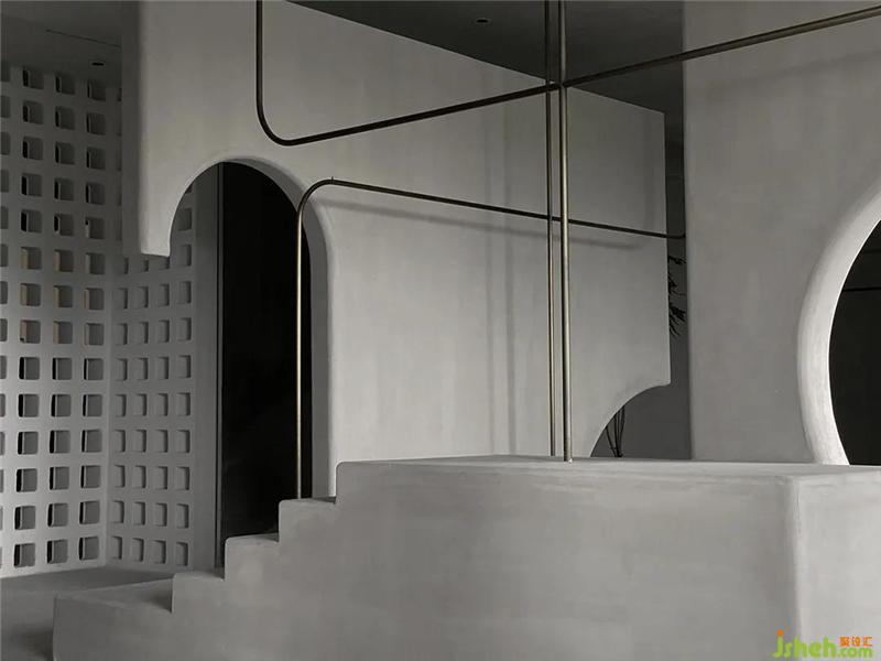 兩展示空間均用陣列形式的空間磚作為半隔斷,將南北的光源成功引入室內(nèi),弧形的線都由面狀切割而成。