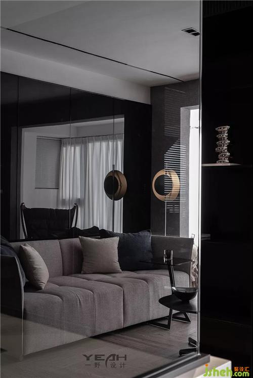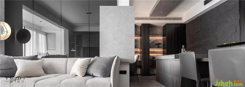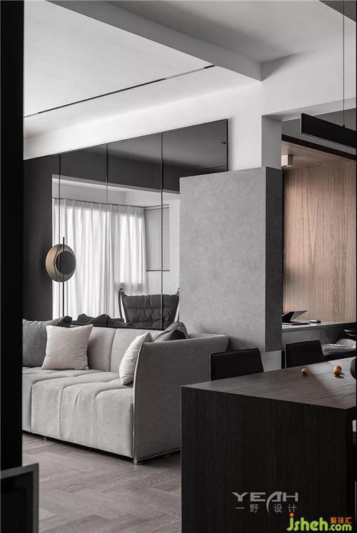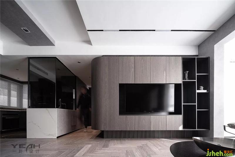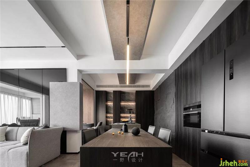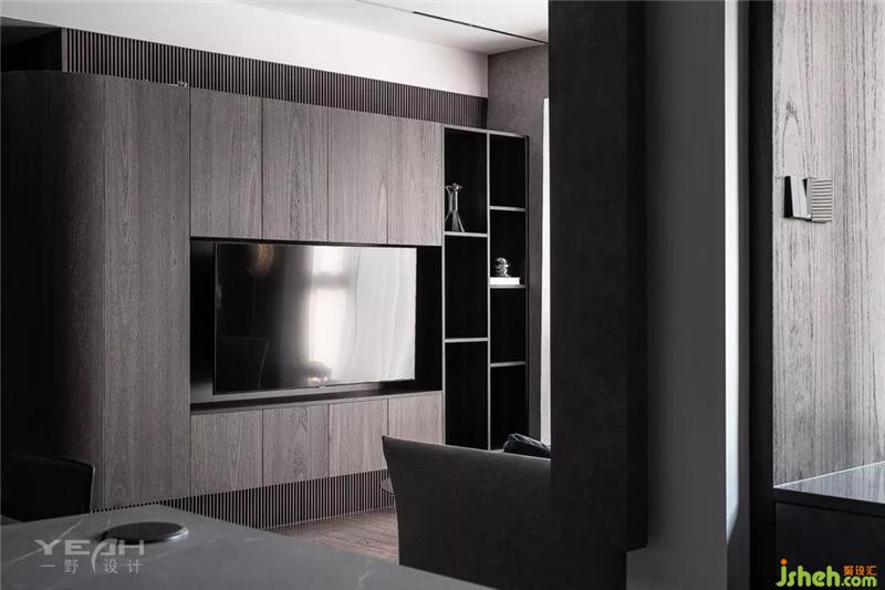 深色幾乎覆蓋了整個(gè)空間和家具,通過不同材質(zhì)的運(yùn)用、構(gòu)造形式與尺寸建立了整體視覺層次變化比較豐富的現(xiàn)代空間。