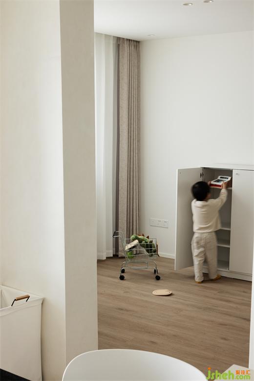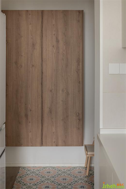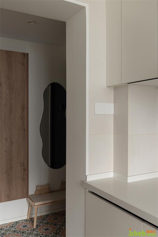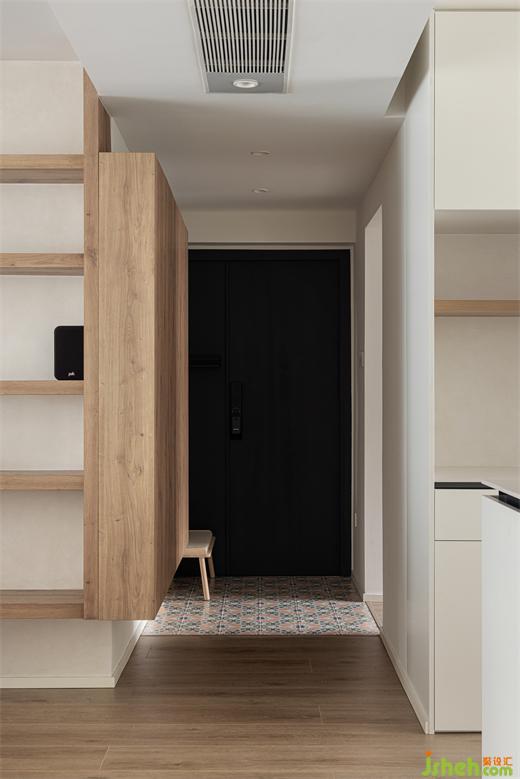 入戶玄關(guān)以原木色為主,搭配花紋瓷磚,細(xì)膩精致,點(diǎn)綴空間色彩之余,也為生活增添了一絲趣味性。一把方凳小巧溫潤(rùn),潛藏著細(xì)致入微的貼心。湖左岸大平層裝修設(shè)計(jì)懸挑式鞋柜增添空間立體感與時(shí)尚度的同時(shí),也為日常清潔提供便利。