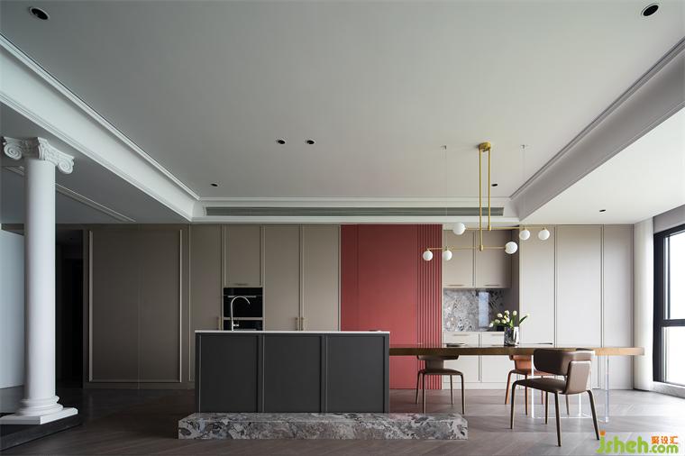木質(zhì)與大理石構(gòu)筑的空間簡約而有質(zhì)感,金屬和皮質(zhì)穿插其中,蘇州大平層設(shè)計渲染出精致高雅的用餐氛圍。