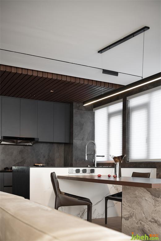 開放的公共空間讓一家人的聯(lián)系更緊密,依據(jù)功能屬性則設(shè)計(jì)有所區(qū)別。木飾面吊頂在空間畫出一道涇渭分明的線,貴陽豪宅設(shè)計(jì)將烹飪區(qū)與用餐區(qū)分隔開來。深色調(diào)與石材結(jié)合,彰顯質(zhì)感的同時(shí),蘊(yùn)藏日常生活的智慧,讓清潔工作更簡單便捷。