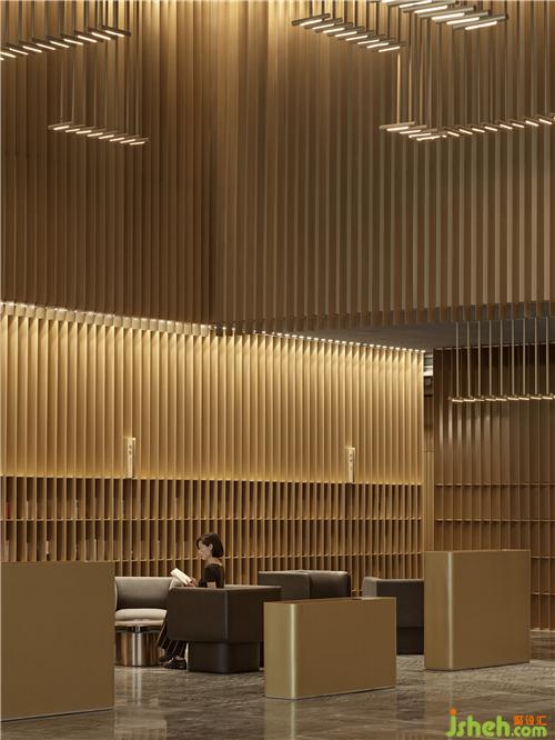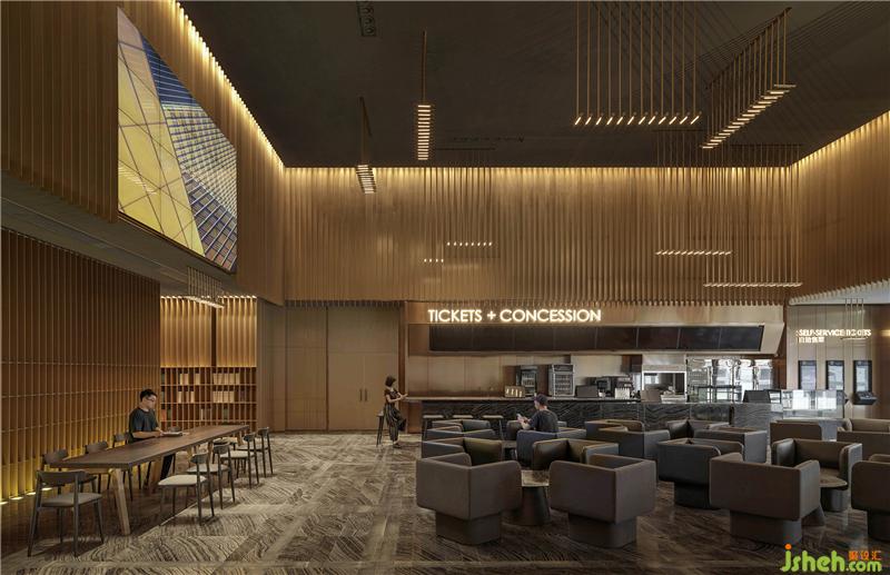 每一根琴弦平行排列,從低音到高音,根根琴弦清晰可見(jiàn),供樂(lè)手演奏,設(shè)計(jì)師將“琴弦”特點(diǎn)融入到空間設(shè)計(jì)之中。于是,設(shè)計(jì)師將影院的大堂四周設(shè)計(jì)成一列列豎向的格柵,并且從天花一直延伸到地面。整個(gè)項(xiàng)目從最開(kāi)始的功能設(shè)計(jì)階段,就考慮融入一個(gè)小型的書店,設(shè)計(jì)師腦中浮現(xiàn)文人雅士撫琴讀書的場(chǎng)景,于是我們也將琴弦的概念統(tǒng)一的表現(xiàn)在書店的部分,來(lái)增強(qiáng)這兩種文化元素的組合;統(tǒng)一的設(shè)計(jì)手法延伸到書店,圖書區(qū)書架與整體造型一致,延伸下來(lái)的造型,其中三層被用作書架使用;琴弦和圖書的組合,讓人們?cè)谛菹^(qū)別外增添了一份禪意,我們也并沒(méi)有用過(guò)多和過(guò)于復(fù)雜的顏色,用燈光的效果來(lái)增強(qiáng)空間之中的光影變化,以此來(lái)強(qiáng)調(diào)其文化的屬性和特點(diǎn)。電影院設(shè)計(jì)