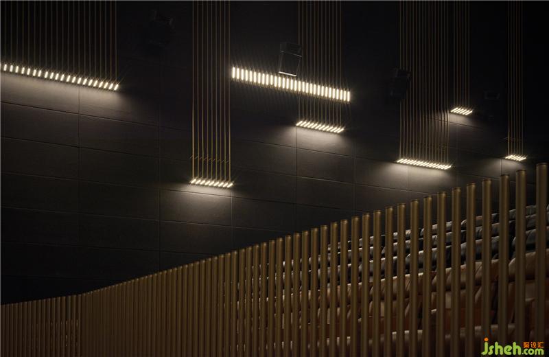 影廳的通道中,室內設計師將琴弦的概念延伸進來,天花上的燈具和地面的拼花,也圍繞著“琴弦”的設計展開,隨處可見的“琴弦”一樣的壁燈和天花燈在走道中延伸開來。巨幕影廳中的設計尤為壯觀,大空間中,從天花延伸下來的“琴弦”,以不同高度的排列在一起,連接著地毯的圖案。并且設計師將傳統(tǒng)的護欄造型改造得更加巧妙,好似琴弦排列開來,同時也注重到護欄的安全性能。以此來體現(xiàn)該影城的獨特電影院設計之處。