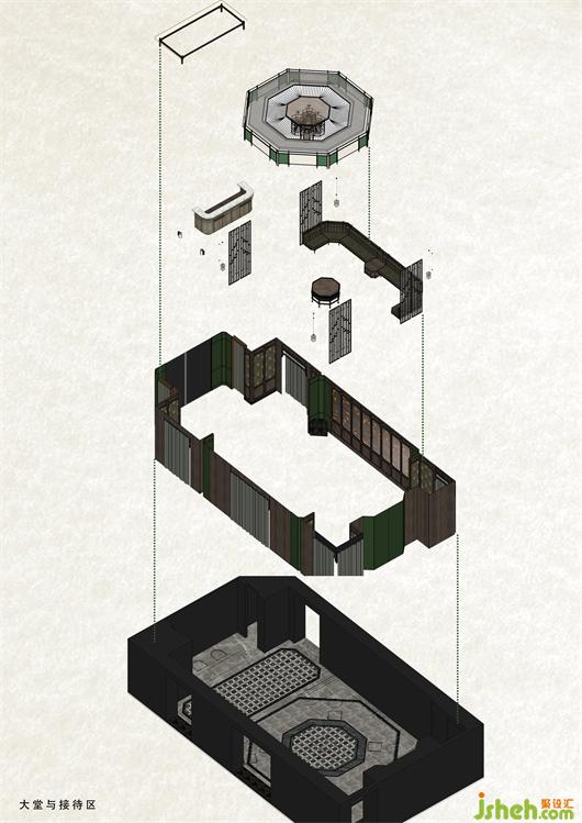 接待區(qū)在大廳的側面,用循序漸進的引導方式開啟穿梭空間的體驗。養(yǎng)生店設計整體空間上講究圍合性與對稱性,玻璃屏風在不破壞整體環(huán)境的同時又提升空間的私密感,使兩個空間各自獨立而又相互依賴。