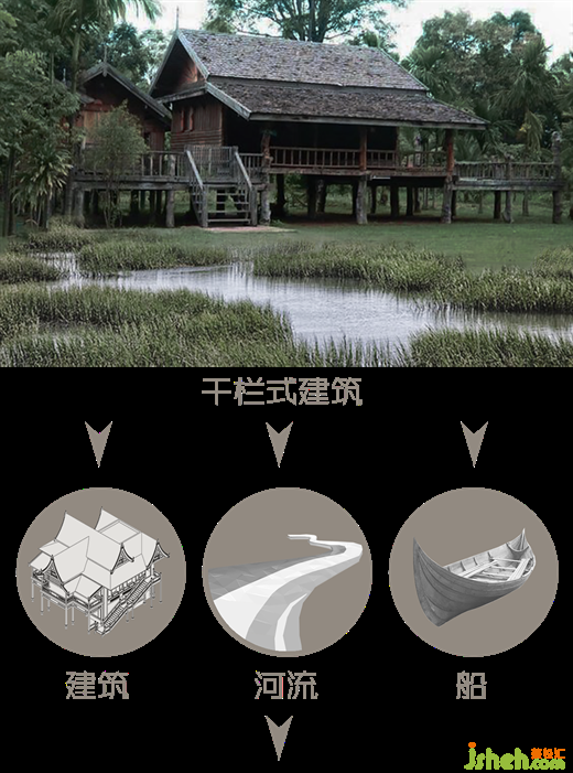 受宗教影響,當?shù)氐慕ㄖ庥^趨向于層次豐富的結構。另一方面,建筑形式汲取了十八世紀的舶來文化,養(yǎng)生店設計在傳統(tǒng)的基礎上,加上了居室前加連廊的建筑方法,使得室內(nèi)南北通透、減少濕氣,并形成了固定的建筑構式。我們將企業(yè)文化融合進設計,以泰國傳統(tǒng)家庭的建筑形式“干欄式建筑”作為框架基礎。