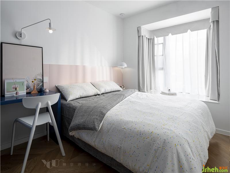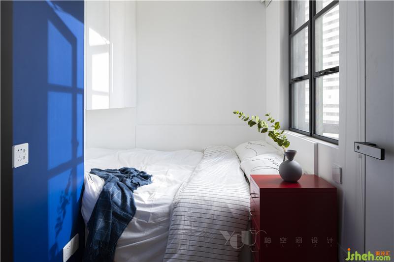 柜子、床頭延續(xù)了外廳的紅藍(lán)配色,但比例不大,整體的軟飾還是以素雅為主,更多的考慮了主臥室的睡眠功能,擔(dān)心大面色塊影響到入眠情緒。