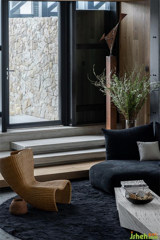 鋼梁和老榆木在天花形成縱橫的組合結(jié)構(gòu),為空間創(chuàng)造了一種近乎雕塑的質(zhì)感,喚起了一種既原始又精致的風(fēng)情;結(jié)合電視墻石材自然的表面紋理和凹凸不平的粗獷質(zhì)感,深圳別墅裝修設(shè)計(jì)與Medoc梯形橫鋸紋的木地板,展現(xiàn)了自然與現(xiàn)代的結(jié)合,亦是一種對于現(xiàn)代建筑美學(xué)的回溯和反思。