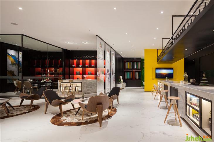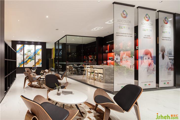 另一處洽談區(qū)設(shè)置在小吧臺(tái)旁邊,仿家庭客廳的裝飾讓客戶更直觀的了解到單色涂料在日常生活的應(yīng)用效果。