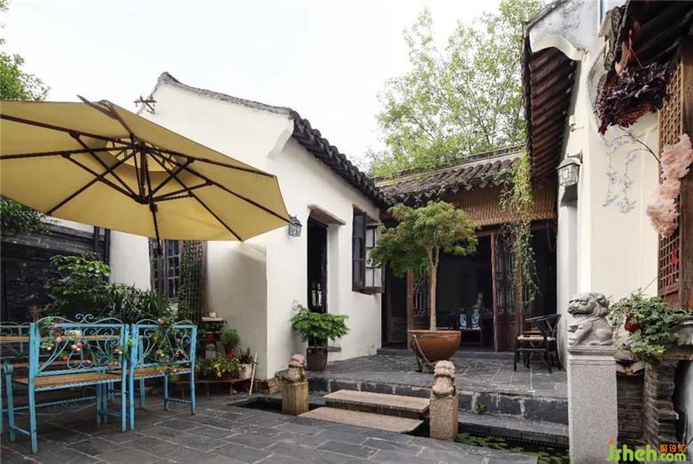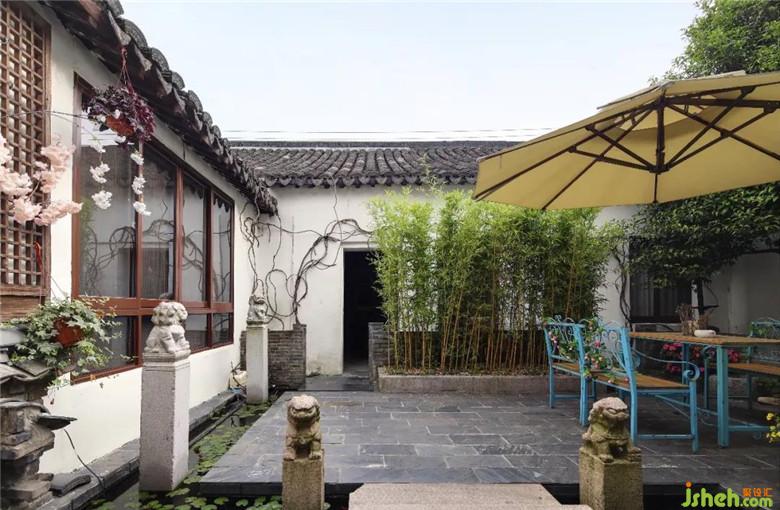 在庭院中,可以看到以藍(lán)色桌椅、遮陽傘為點(diǎn)綴,為進(jìn)入此門的人帶來一種假期中的休閑。且設(shè)計(jì)師別出心裁地使用水與浮葉作為分隔工具,以石階作為連通兩者之間的工具,在石階兩旁各擺一只小石獅。當(dāng)有來客穿行之間,可再為其洗濯身上所攜煩惱。