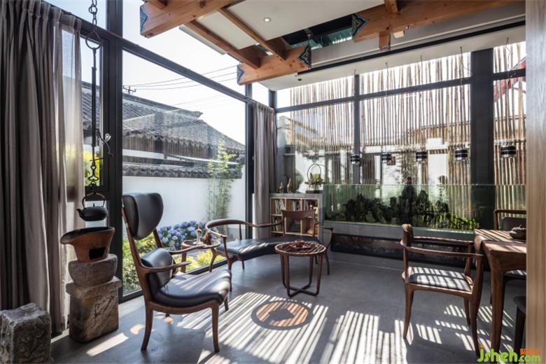 大大的落地窗,水缸中的山形造景……