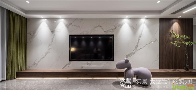 除去多余的修飾,黑色電視鑲嵌在大理石的墻面中,憨態(tài)可掬的小馬座椅為空間增添了幾分靈動的樂趣。