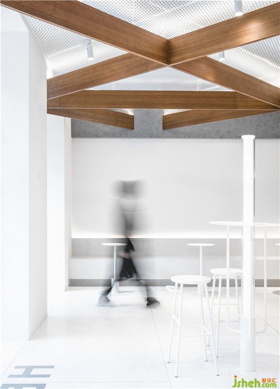 The light belts hidden wooden frame in the ceiling produce the diffused reflection to create the soft illumination and atmosphere for the interior, with the spotlights as a visual partition to divide the seating areas and passages.