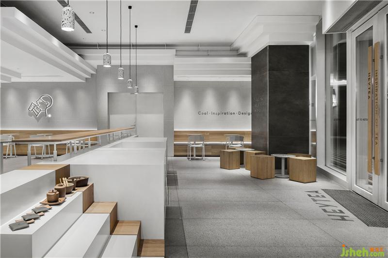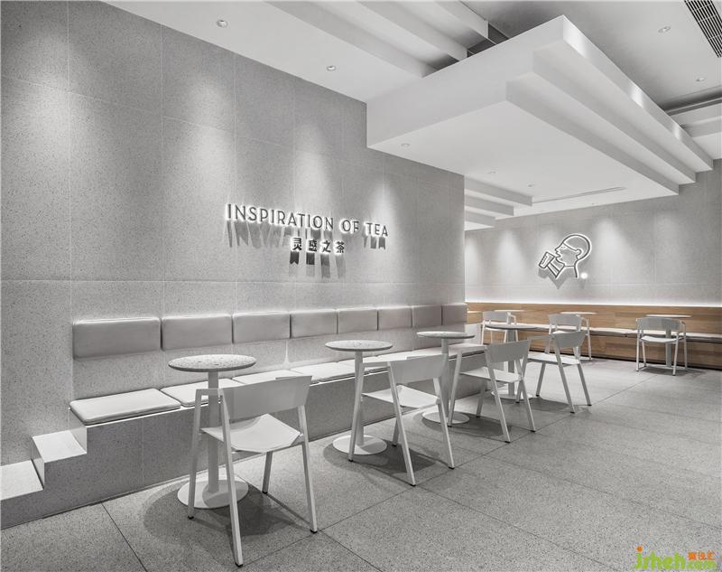 從室外看向室內(nèi),虛實交錯的體塊造型鋪滿空間,中島組合成陣列分布,形成了張弛有度的友好姿態(tài)。奶茶店設(shè)計