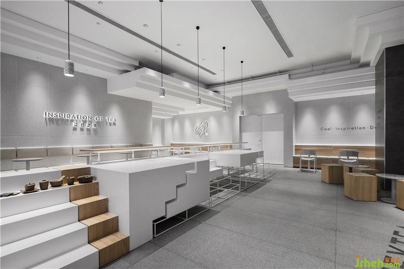 設(shè)計構(gòu)想來源于《紀念碑谷》中縱橫交錯的空間形態(tài),以打散重組在空間中的臺階做為概念的表現(xiàn)形式,錯落有致的體塊結(jié)合臺階形態(tài),自上而下延伸至整個空間。在材質(zhì)及造型上,為緩解小空間固有的壓迫感,使用白色基調(diào)和方正的體塊拓展空間界面。奶茶店設(shè)計