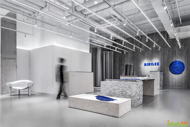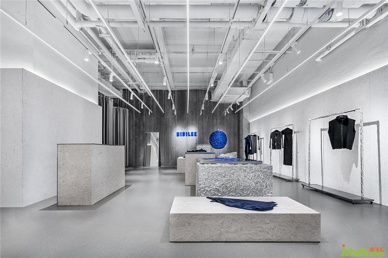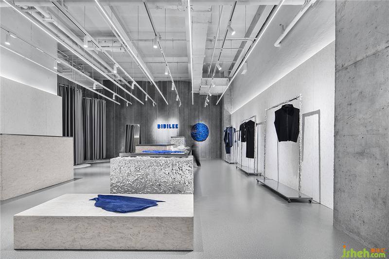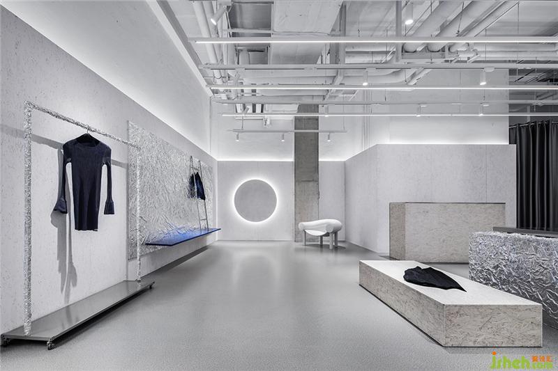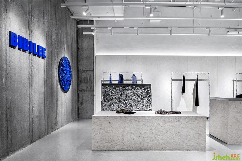 結(jié)合場地條件與工期要求,設(shè)計師拋棄傳統(tǒng)服裝商業(yè)空間對展陳設(shè)計的過度追求,保留了混凝土柱和部分混凝土墻壁原有的材質(zhì)肌理,天花僅僅做了噴白處理。刷白的定向刨花板將空間的底部墻面圍合,并結(jié)合冷冽的不銹鋼搭建出了空間中部的展臺,天花線性的燈帶則強調(diào)了一種秩序感——空間中沒有冗余的外在裝飾,顯示出一種克制的實驗美感。