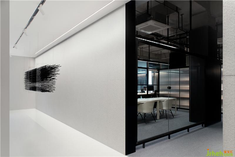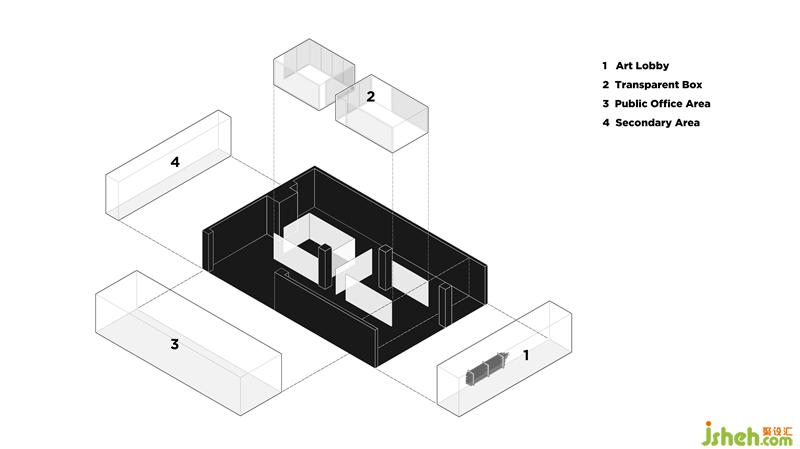 我們?cè)诳臻g中央置入兩個(gè)透明盒子,以此將空間劃分為四個(gè)區(qū)域:藝術(shù)前廳、透明盒子區(qū)域、公共辦公區(qū)與輔助區(qū)域。