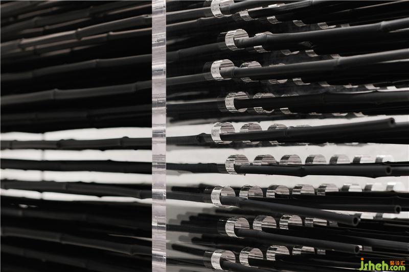 面向中央走廊的區(qū)域被劃分為藝術(shù)前廳,在純凈的灰白色麻石墻面的襯托下,黑色竹子構(gòu)成的立體書(shū)法筆觸藝術(shù)裝置,深圳辦公室設(shè)計(jì)在為社區(qū)住戶提供有趣的展示面的同時(shí),也有效的劃分了空間,將需要專注的辦公區(qū)域隱于其后。
