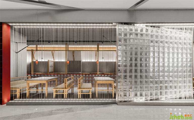 南寧餐廳設(shè)計店鋪入口展面分布雨景意境區(qū),以真實的落雨場景結(jié)合線性燈光,中間穿插半透明的玻璃磚造型,構(gòu)成一幅雨中的畫卷,將“雨中的武林世界”在入口處就直白地展現(xiàn)出來。