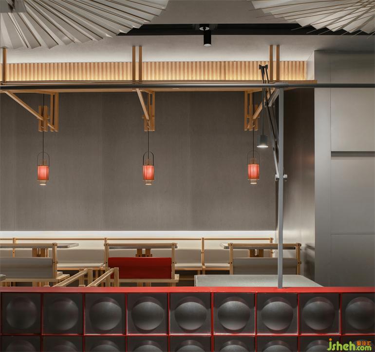 在空間的另外一側(cè),屋檐相對而設(shè),南寧餐廳設(shè)計在屋檐之間,五個大型雨傘裝置被安裝在天花上,并以不同方向交錯的緩慢轉(zhuǎn)動,成為空間中有趣的視覺體驗。