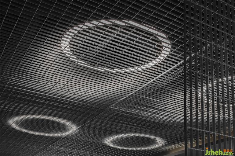 The ring-shaped luminaires inside the metal mesh on the ceiling are kept at a certain distance from the mesh. With the thickness of the mesh itself, the physical light source and the halo of light mapped onto the mesh are actually constantly changing as customers move around, which corresponds to the properties offilm as an art of light and shadow.