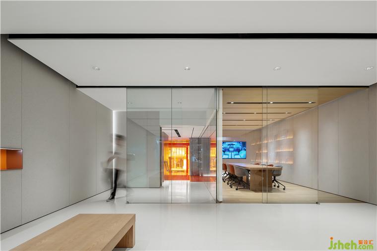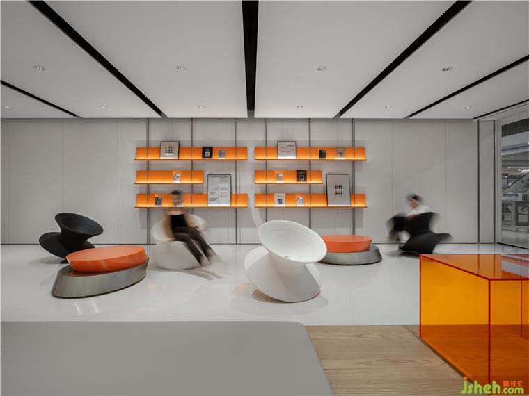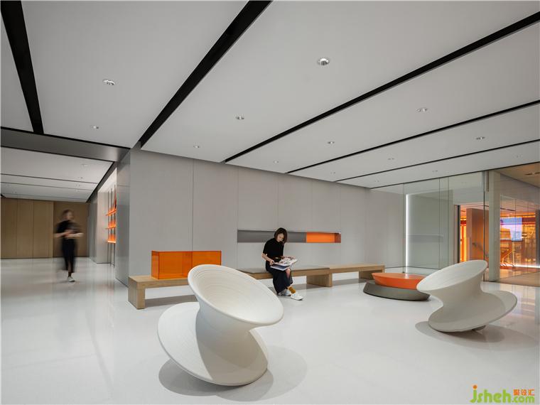 樓梯連通至二層的藝?yán)葏^(qū),極氪中心展廳設(shè)計(jì)通透的展廳為活動(dòng)和展覽提供了空間,包括一個(gè)可供社群活動(dòng)使用的會(huì)議室和開敞的展廳——這是一個(gè)更加靈活、開放、可變的空間,鼓勵(lì)人們探索空間與生活互相激活的可能性。