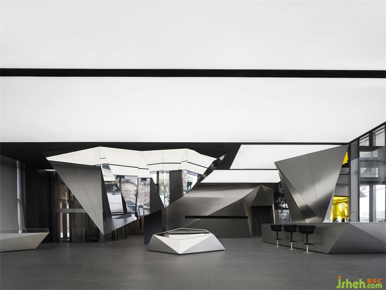 體驗中心設(shè)計從室內(nèi)向外生長的棱鏡造型,與建筑外部的雕塑達成銜接