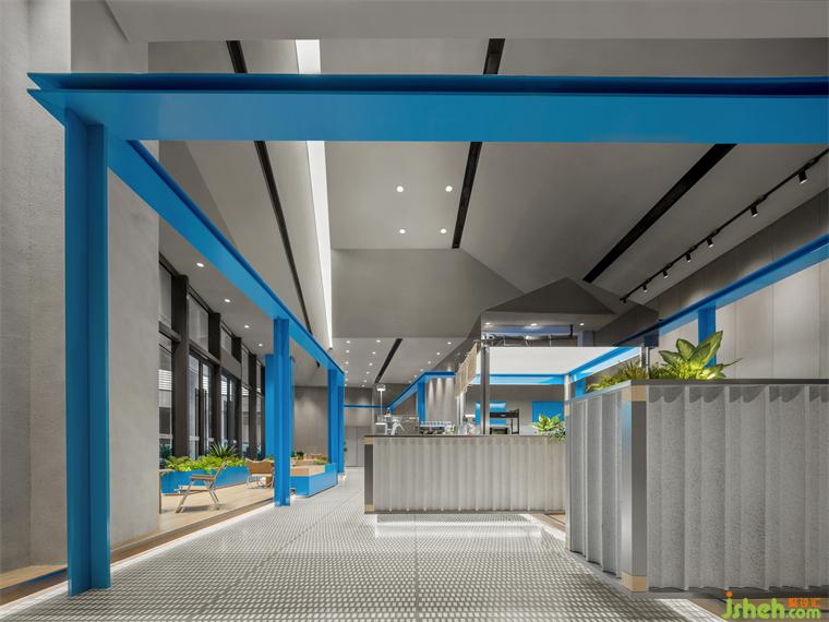 “設(shè)計(jì)師期望把休閑庭院的感受再次帶給用戶,提取傳統(tǒng)元素中的“廊”、“柱”、“亭”等元素,又將其做了現(xiàn)代化的重構(gòu),借空間的縱向尺度凸顯結(jié)構(gòu)張力,并融合藍(lán)色曲廊和鏡亭,構(gòu)筑具有現(xiàn)代審美趣味的都市休閑庭院。