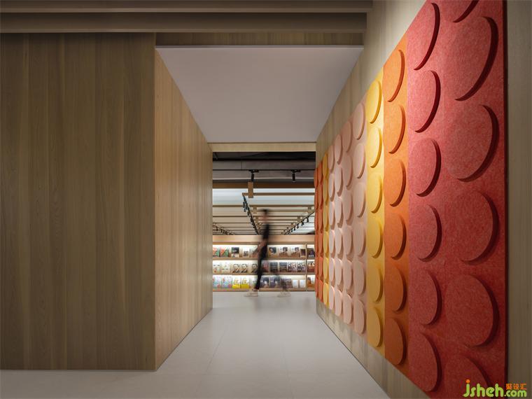 穿過(guò)挑空中庭走廊的公共閱讀區(qū),可供人們獨(dú)立學(xué)習(xí)的自習(xí)室和沉浸式劇場(chǎng)位于空間安靜的一角。