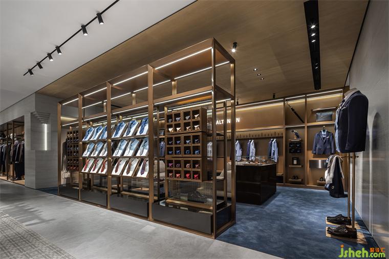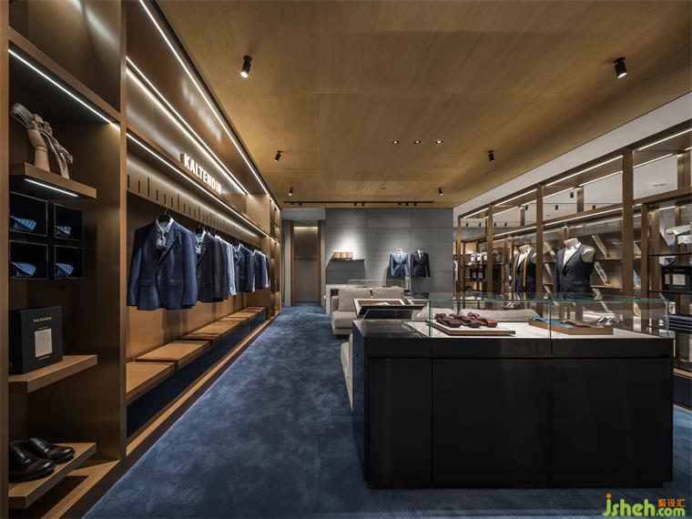 專賣店設(shè)計(jì)高定區(qū)通過深藍(lán)色的地毯沉淀出沉穩(wěn)的調(diào)性,經(jīng)典的家具與木質(zhì)的天花共同構(gòu)建出高雅的氛圍。