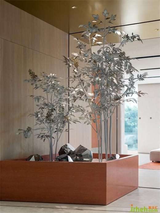 南天竺的形態(tài)被藝術(shù)性地呈現(xiàn)在空間中,設(shè)計(jì)師運(yùn)用銀色和金屬以及米灰色的皮革,以人造的質(zhì)感模擬植物的葉片。藝術(shù)裝置點(diǎn)綴著金色金屬制成的果實(shí),將綠植轉(zhuǎn)化為引人注目的藝術(shù)品。