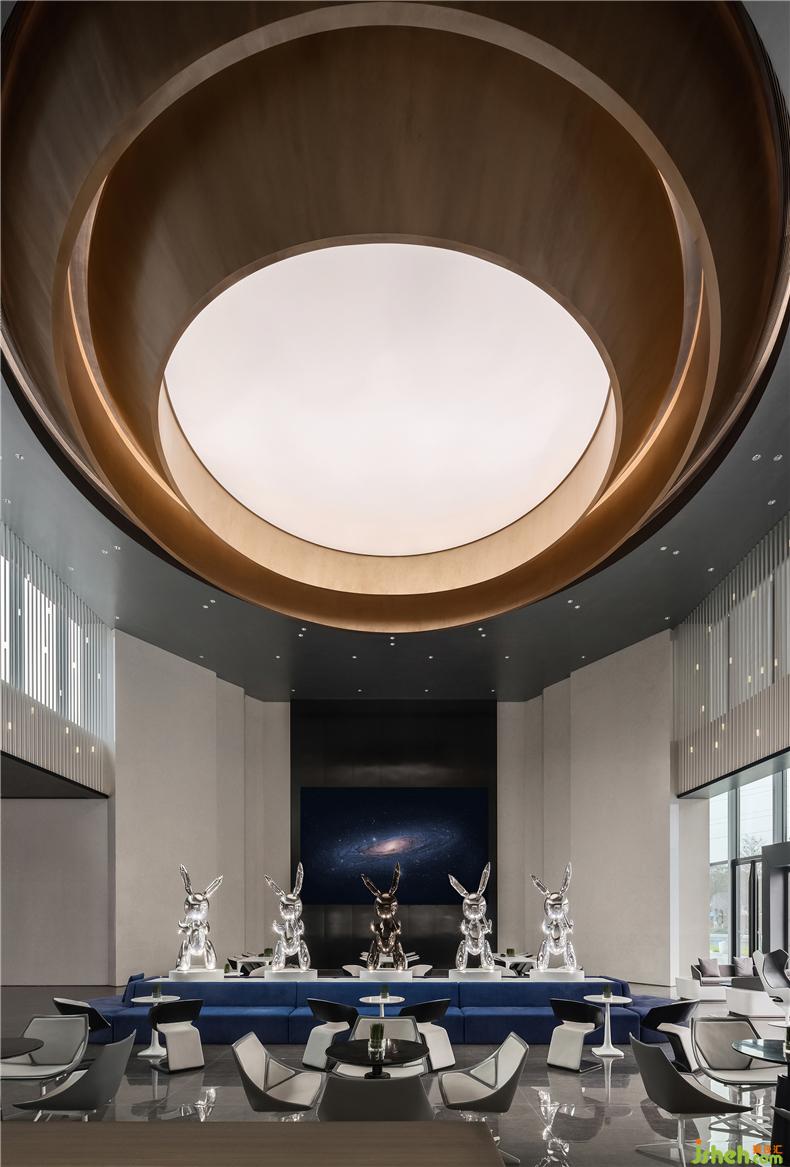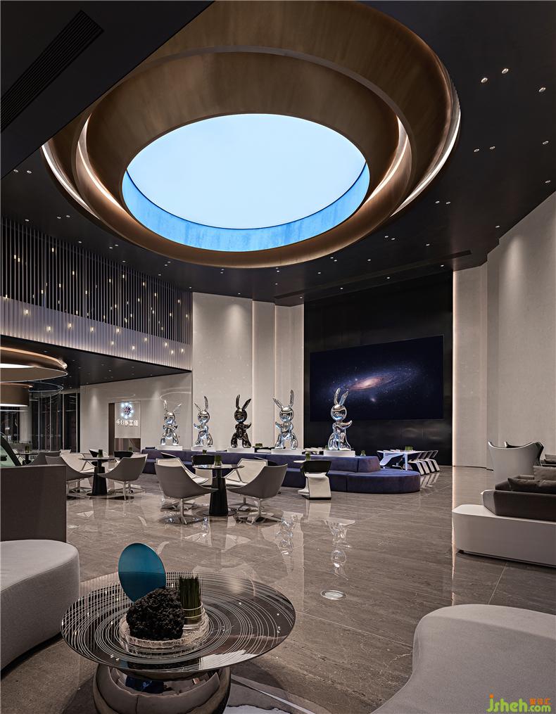 以點(diǎn)繪圓、思想延伸,是這個(gè)項(xiàng)目在理念和故事上的共性,基于手游、電競(jìng)蔚藍(lán)科技的想象,室內(nèi)團(tuán)隊(duì)以星為象的宇宙空間概念引發(fā)建筑園林景觀(guān)設(shè)計(jì)的連續(xù)性思維,在未來(lái)科技主題中還原一個(gè)和諧共生的宇宙家園成為這片領(lǐng)域的共同夢(mèng)想,室內(nèi)展示空間是這片未來(lái)家園的縮影。