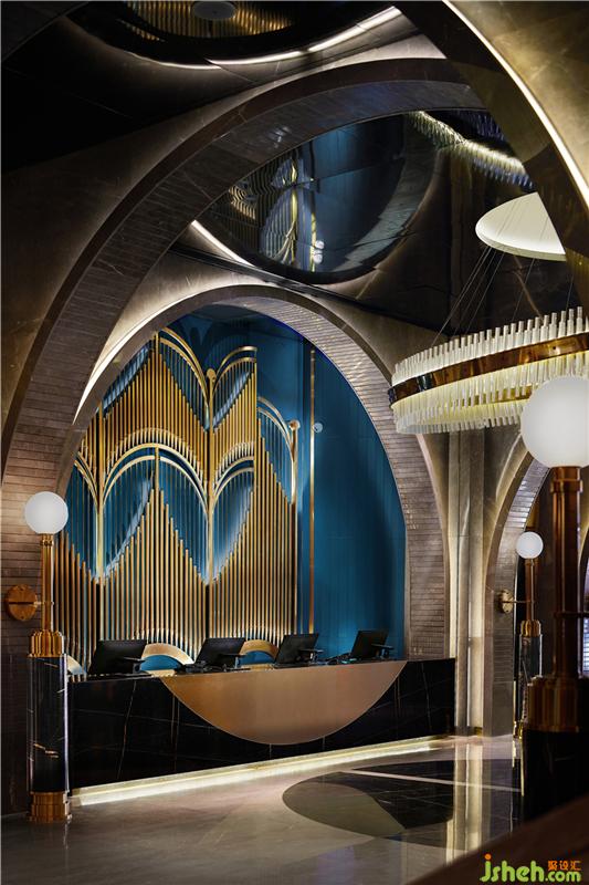 管弦樂器材質(zhì)運用在整個大堂和走廊空間的裝飾中,連接大廳與走廊音樂殿堂空間主題,設(shè)計師在收銀臺后面風管琴造型背景墻上,開啟現(xiàn)代版“歡樂頌”樂曲的彈奏。