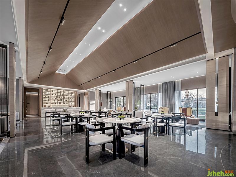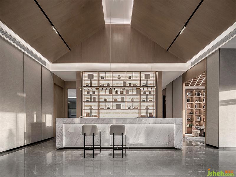 門口四水歸堂的空間造景開始,以敘述的方式通過功能區(qū)動線的起承轉(zhuǎn)合,在銷售中心空間里營造天圓地方的視覺效果;整個空間的支撐,采用榫卯結(jié)構(gòu)固定的石材屏風實現(xiàn)支撐力和觀感的雙向想效果,延伸至墻身玻璃材質(zhì)的通透,營造若隱若現(xiàn)的觀感,模糊內(nèi)外界限,視角廣遠,知其所止亦知其不止,恰恰映射滔古品牌居住情懷,熱望未來,不負每一寸土地。
