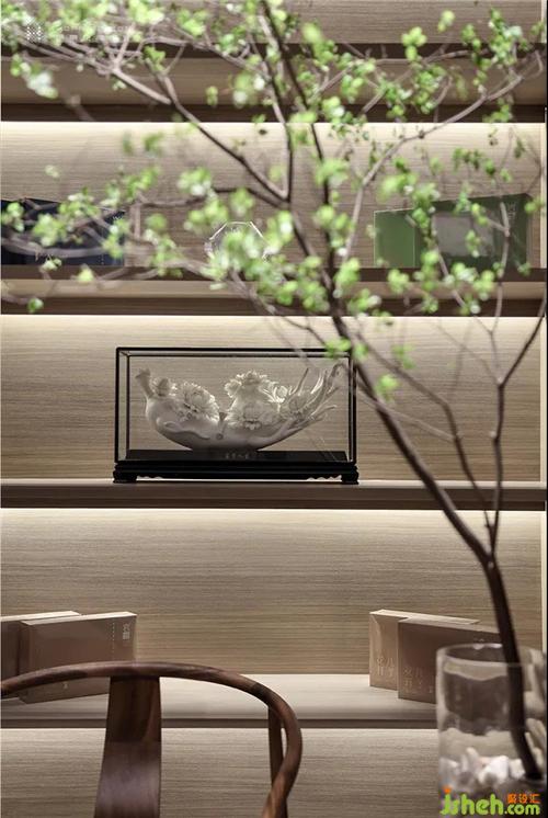 聞一曲悠然,飲一壺好茶。柜體線條簡單明了,暗藏于柜內(nèi)的燈管讓古玩藏品脫離平庸,與生機(jī)勃勃的樹影形成對偶,創(chuàng)造出一副鮮活有趣的意象畫卷。