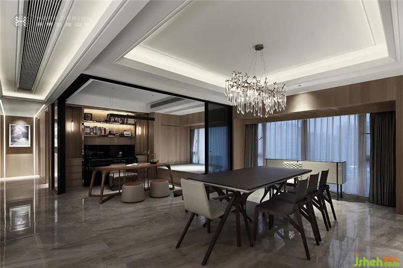 從客餐廳中可以看到設(shè)計(jì)師對光線、材料選擇、空間構(gòu)成的思考,不僅考慮到自然光線的引入,也考慮到不同類型的燈光設(shè)計(jì)組合去塑造空間,為空間帶來充足光源的同時(shí),也提供了美觀造型。配合上不同的材料,光更加是產(chǎn)生出不同的視覺質(zhì)感,更能把想傳遞的情感都放到了空間里。