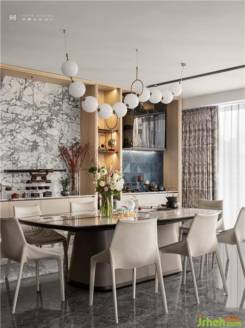 用餐區(qū)域精心挑選輕柔色,與珍珠項鏈般白色吊燈搭配呈現(xiàn)出和諧成熟的效果,混合著柔紗透過的日光浴讓整體更加溫馨明亮。